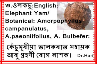 English: Elephant Yam / Botanical: Amorpophyllus campanulatus, A.paeoniifolius,A. Bulbefer: কেঁচুমূৰীয়া ভালকৰাত সহায়ক আৰু গ্ৰহণী ৰোগ নাশক।