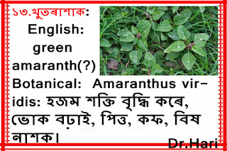 English:green amaranth(?) Botanical: Amaranthus viridis: হজম শক্তি বৃদ্ধি কৰে, ভোক বঢ়াই, পিত্ত, কফ, বিষ নাশক।
